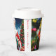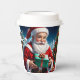 This paper cup features a festive red and green colour palette adorned with cheerful illustrations of Santa Claus and Christmas trees,. The design incorporates playful typography that spells out holiday greetings, adding a warm, inviting touch perfect for seasonal beverages and Christmas gifts . It evokes a cosy atmosphere, making every sip feel like a celebration.