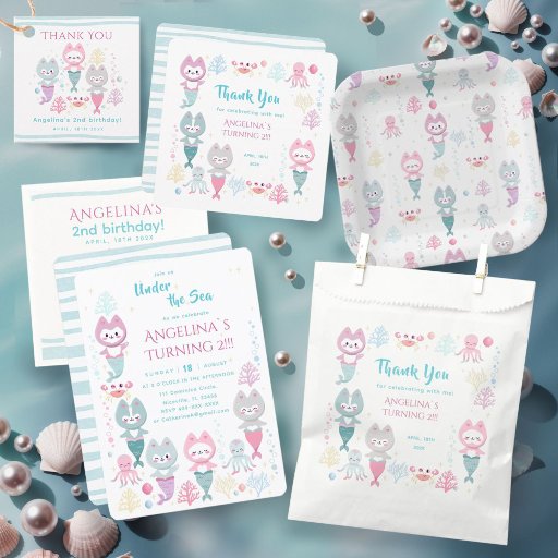 Nautical Themed Birthday Paper Cups Decorated with Cute Mermaid Kittens.