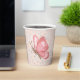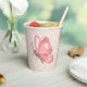 Painted pink butterfly on a bed of floral lace and blue confetti.Customisable text.
