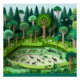 This design mimics the look of layered paper-cut art to create a lush forest scene. Multiple shades of green are used to depict trees, shrubs, and the forest floor. Intricate details include small animals, birds, and insects hidden throughout the scene. The layered effect gives the illusion of depth, creating a 3D appearance. This poster appeals to nature lovers, fans of handicrafts, and those seeking textured, tactile-looking art.