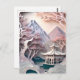 A lovely faux paper cutout landscape postcard with mountains, pavilion, and trees.