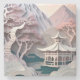 A lovely faux paper cutout landscape stone coaster with mountains, pavilion, and trees.