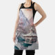 A lovely faux paper cutout landscape apron with mountains, pavilion, and trees.