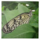 This awesome tile features a photograph of a beautiful tropical butterfly. This species is called a Paper Kite Butterfly (Idea leuconoe). It has beautiful black and pale yellow markings all over its wings. It has its wings folded while it rests on some leaves. This butterfly is also known as the rice paper butterfly. It comes from Southern Asia and Indonesia. The photograph was taken using macro photography for a stunningly detailed result.