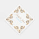 Party paper napkins shown in the white lluncheon size with a print of a fancy Golden colours leaf borders. Couple's last name highlighted in Sky Blue-Turquoise for you to personalise to your name choices. First names in a Golden colour. Coordinates with "gold fancy leaf border favour box" and the "gold fancy leaf border reception invitation card".
