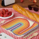 This artwork channels a retro graphic spirit, forming the letter‑like curve with parallel bands of red, orange, yellow, light blue, teal, and purple. The layered arcs flow in harmony, evoking the bold optimism of 1970s design. Set against a soft beige background, the vibrant rainbow palette stands out with clarity and rhythm. The composition balances simplicity and dynamism, creating a timeless visual that feels both nostalgic and modern.