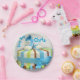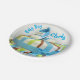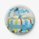 Adorable and special baby boy 7" paper plate, with a round cake with blue, yellow, and blue stripes on white frosting. Blue ribbon around cake with bow! On top of cake has blue and white baby shoes, with baby boy, Chris. Ready to serve, a real time saver! See in store for other items in this theme!