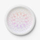 Mosaic design with four pattern rings. Central circle of six segments, next circle has six ovals with circles inside. Eleven small sunbursts inside band that is trimmed with tiny circles. Fifteen diamond petals holding a circle create the outer ring. Simple, elegant design filtered with a faint colouring of the rainbow.