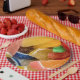 The image of colorful Jellied Fruit Slices cover these paper plates.