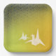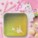 Paper plates with folded paper cranes and saaya-shaped patterns are suitable for celebration. On the gold-colored ground, the saaya-gata, a traditional Japanese pattern often used as a kimono pattern or fusuma pattern, was painted in dark blue, and a pair of paper cranes were attached. The saayagata with continuous patterns means that it continues continuously for a long time. The paper cranes also reflect the prosperity of the family, the longevity, and the recovery from illness. Traditionally, cranes have been regarded as auspicious birds, and have been used as a symbol of marriage well being in wedding kimono patterns. Paper cranes and thousand paper cranes are known as symbols of peace.
