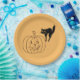 Jack-o-lantern pumpkin is smiling up at a startled black cat. Background is orange.