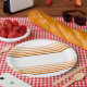 Orange lines in varying five shades Dark to light, bottom to top. Two Sets of stripes are placed diagonally at opposite corners (square plate).