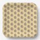 Holiday ornament in grey etching, is tiled across pale yellow paper. Ink drawing of a round tree decoration with "Peace on Earth" beneath 3D looking arches that support the "roof" of the orb. Golden hook at top of ball. Original artwork by John Alexander Muir.