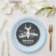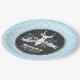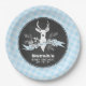 Blue woodland paper plates for boy baby showers. Features blue gingham, chalkboard graphics, and woodland deer.