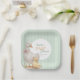 These charming baby shower Paper Plates feature a delicate vintage watercolor illustration of Mother Goose and Gosling, creating a warm and touching story of love and care. The delicate image is framed in an elegant oval border and set against a classic pastel green striped background, inspired by timeless nursery designs and fairy tales.