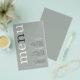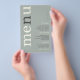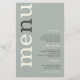 Paper Simple Sage Ivory Typography Wedding Menu. A great value PAPER (not card) alternative at a budget price. A modern typographical design with Menu in large typography in Ivory with the ”n” in grey, rotated and to the left hand side on a background of light sage green. Background colour on each side can be changed if you wish via Customise further.