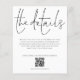 A great value Budget priced PAPER (not card) alternative in a SMALLER size 4.5” x 5.6” without envelopes - standard A6 envelopes are the nearest size to fit. Paper Wedding Details QR Code Script Enclosure. Let your guests know details such as directions and accommodation information for your wedding when you send their invitations. This elegant design has set stylish large typography for the heading The Details and the rest of the text can be easily personalised to your words along with your website QR code. You can choose any colours of your choice for the text and background colours on both sides via the customise further option. Your QR code will be automatically generated to update the sample code in the design, when you simply change the sample URL in the template with your own wedding website URL.
