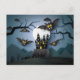 Papercut-look haunted castle on a hill with a full moon, mountains, trees, and cute bats.