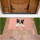 The soft pastel coral background adds a warm and cheerful touch, perfect for welcoming entryways. Designed with extra space at the top and bottom, it allows easy personalization with names, welcome messages, or custom text—making it ideal for unique dog-themed doormats and thoughtful gifts.
