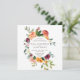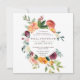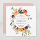 Wedding invitation matches our Paprika Burgundy Floral collection, featuring wedding details nestled inside a circle surrounded by a gorgeous palette of burgundy, gold, coral, blush and leafy greens. All text is fully customisable.
