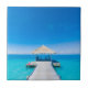 This photo features a sunbather on the pier at a water villas resort on Maldives Island.