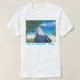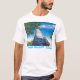 T-shirt with a tropical scene of a boat dock set in the Caribbean or the Florida Keys. Blue waters and sky with a beach and sailboat sailing on the ocean carried by a strong sea wind.