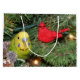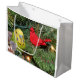 Yellow and green parakeet, or budgie, in a Christmas tree visiting with the red cardinal ornament bird lovers Christmas holiday gift bag. IMAGE WILL ONLY BE CORRECT ON THIS, THE LARGE SIZE BAG