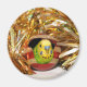 Yellow and green parakeet or budgie peeks out from a broken Christmas ornament surrounded by gold holiday garland bird lovers cute Christmas holiday round fridge ornament