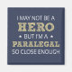 I may not be a hero, but I'm a Paralegal so close enough humourous word art in sans-serif and doodle cross-hatch font lettering in white and golden yellow.