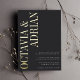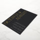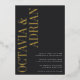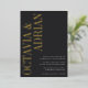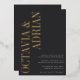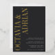 A modern and minimal typography based wedding invitation featuring your names in gold foil serif lettering on a soft black background, running vertically up the left side of the card. Personalise with your wedding details aligned at the lower right.