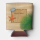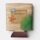 Old parchment paper with palm leaf, stone and starfish on beach sand background.
