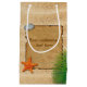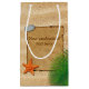 Old parchment paper with palm leaf, stone and starfish on beach sand background.