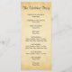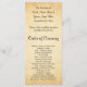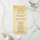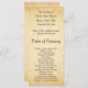 A wedding program design with a printed background design in the style of vintage old paper, designed to look similar to a faux parchment pattern. The background is a pattern print in yellowy beige / tan colours. There is stylish black text that can be personalised.