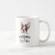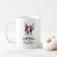 This adorable mug has a cute brown and white watercolor French Bulldog with a small bouquet of purple, peach, and green watercolor flowers and leaves sitting on her forehead. The customisable text says "Pardon my Frenchie".