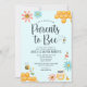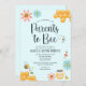 Baby shower invitations honouring the "parents to bee" featuring a honey and bee theme with flowers.