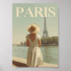 This elegant vintage poster captures a romantic Parisian moment: a woman in a flowing 1950s dress stands gracefully by the Seine River, gazing towards the Eiffel Tower. The scene is bathed in warm, nostalgic tones, with soft reflections on the water and classic Parisian architecture in the background. The artwork evokes the timeless charm of mid-century Paris, combining vintage fashion with iconic landmarks. A perfect piece for lovers of retro elegance, Paris, and classic travel art.