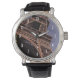 A watch with a photograph of the famous European landmark - the Eiffel Tower taken at an upward facing angle giving it an interesting perspective. The