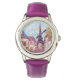 This purple strapped watch has art by Kristie Hubler, inspired by the Eiffel Tower, Paris, France, and the indoor shop facades of Paris Las Vegas, in the pointillism technique, developed by French artist Georges Seurat, the painter of La Grande Jatte hanging in the Metropolitan Museum of Art in NYC