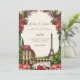 This wedding invitation features a painting of the Eiffel Tower landscape in Paris France with colours of pink and green. Easily edit. You can change the background colour and add your own photo to the backside.