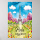 A watercolor painting depicting the Eiffel Tower in Paris, France. The iconic landmark is surrounded by a lush, blooming park with vibrant flowers. The sky is a clear blue with fluffy white clouds.