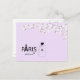 Pretty blossoms on a soft mauve background colour, the words Paris perfume with the Eiffel tower detail. A fancy perfume bottle beside it.