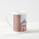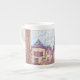 The Paris inspired pointillism on this bone china mug was created by Kristie Hubler, with the Eiffel Tower featured, between wood planks, in a pointillism style