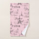 The Eiffel Tower, the words "Joyeux Noël" (Merry Christmas in French), Paris in vintage typography, and vintage French labels for champagne and cocoa and sprigs of vintage holly in black on a pretty pink make a lovely and interesting Christmas bath towel set, for your French themed holiday home decor.
