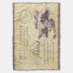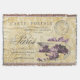 Vintage French postcard features beautiful typography, "Paris" and a purple ribboned box full of lilac flowers on distressed antique wallpaper background