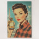 A glamourous 1950s vintage poster featuring a sophisticated woman in red plaid holding a luxurious perfume bottle labelled “PARFUM.” The Eiffel Tower rises in the background, enhancing the chic Parisian aesthetic with bold colours, retro fashion, and classic beauty.