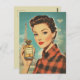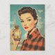 A glamourous 1950s vintage poster featuring a sophisticated woman in red plaid holding a luxurious perfume bottle labelled “PERFUME.” The Eiffel Tower rises in the background, enhancing the chic Parisian aesthetic with bold colours, retro fashion, and classic beauty.