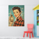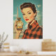 A glamourous 1950s vintage poster featuring a sophisticated woman in red plaid holding a luxurious perfume bottle labelled “PARFUM.” The Eiffel Tower rises in the background, enhancing the chic Parisian aesthetic with bold colours, retro fashion, and classic beauty.