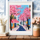 Bring the charm and romance of Paris into your home with this vibrant art poster. The stylised scene features a Parisian street lined with colourful cafes and blooming cherry blossom trees, creating a cheerful and inviting atmosphere. Capture the essence of springtime. Perfect for adding a touch of Parisian flair to any room.