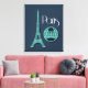 This art features a design of the Eiffel Tower in teal on a dark blue background.