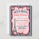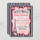 Cute and pretty Baby Shower Invitations with a Parisian Flair. Invite your friends and loved ones to a Paris themed baby shower featuring the Eiffel Tower against a beautiful peachy pink background and pale pink and black stripes. Hand drawn illustration by McBooboo.